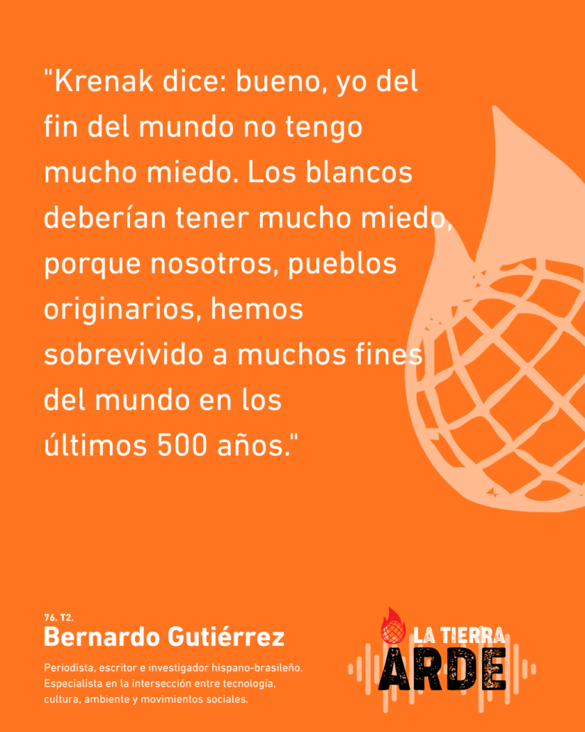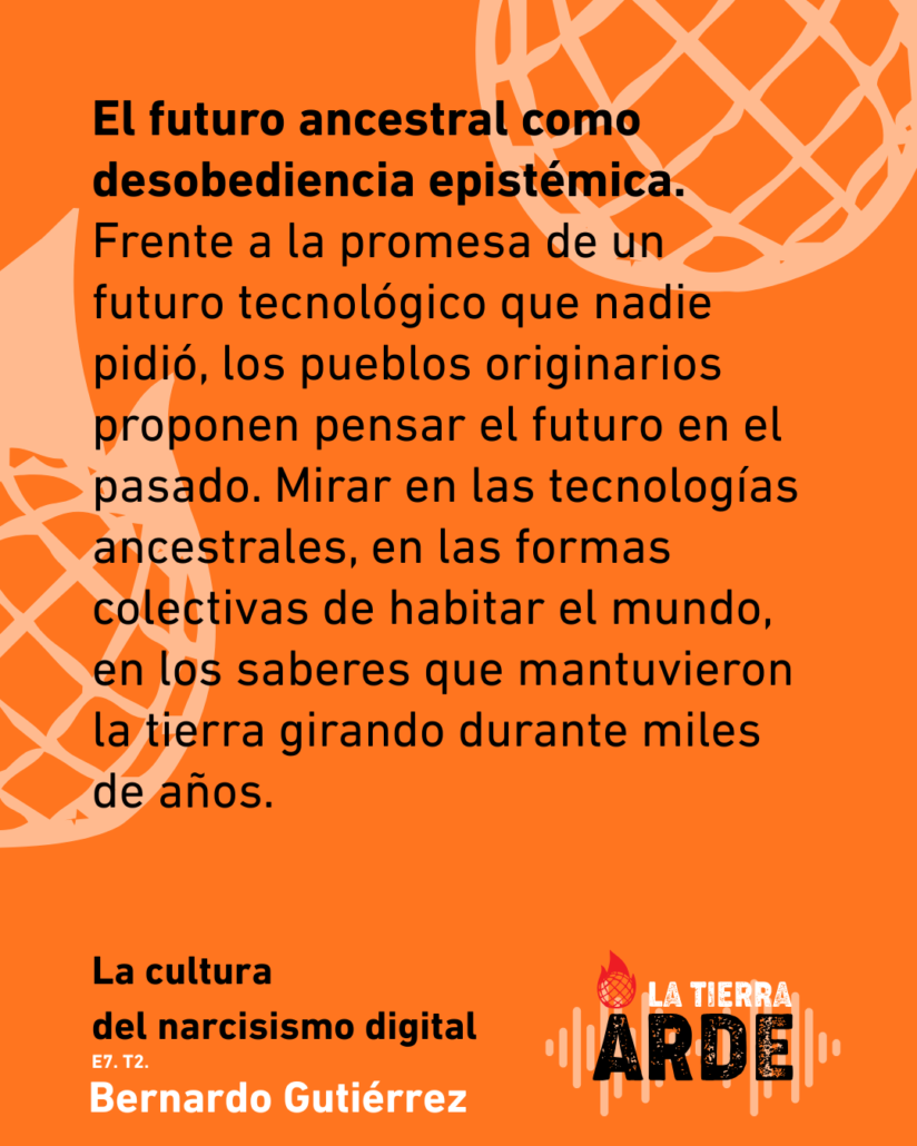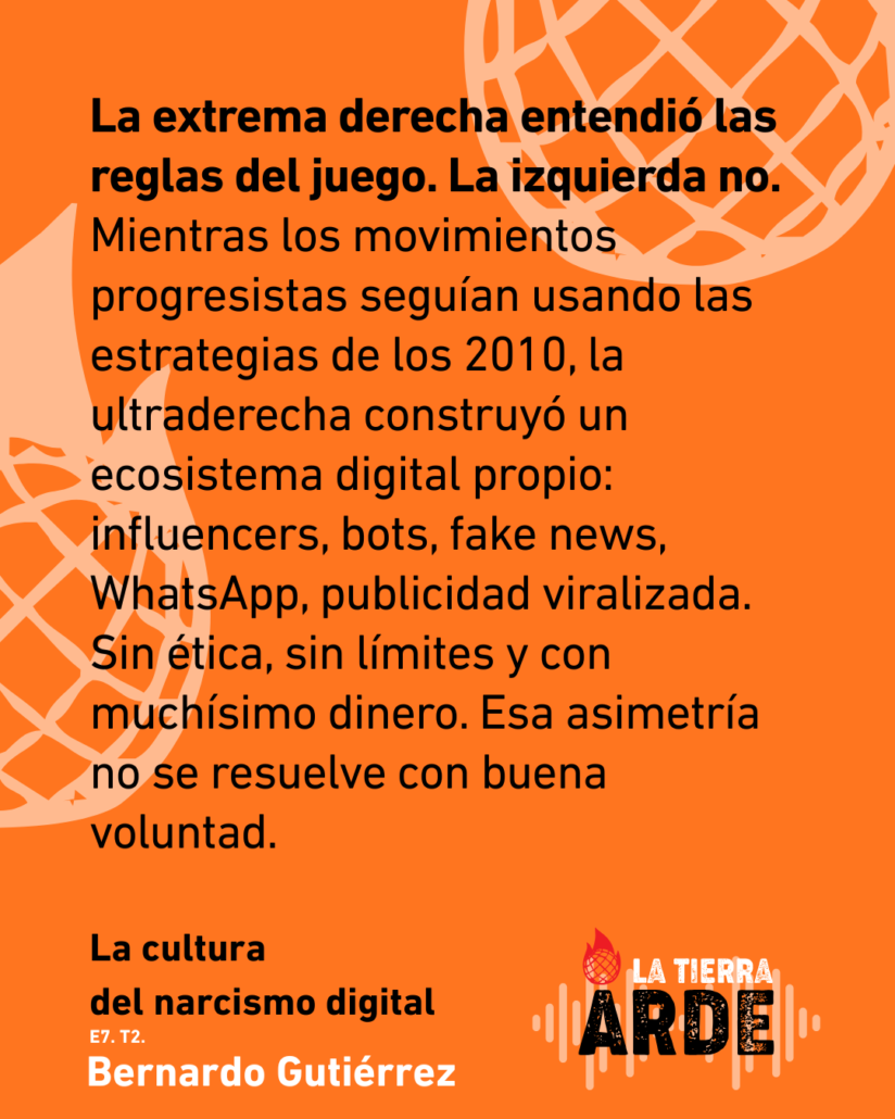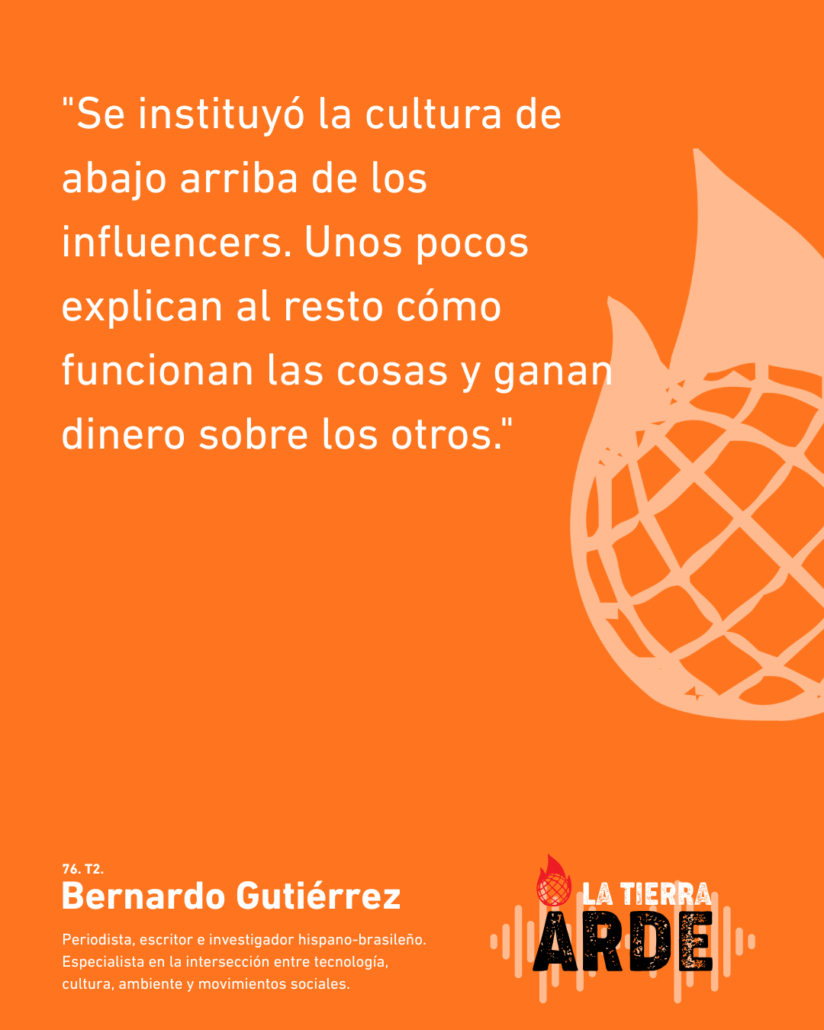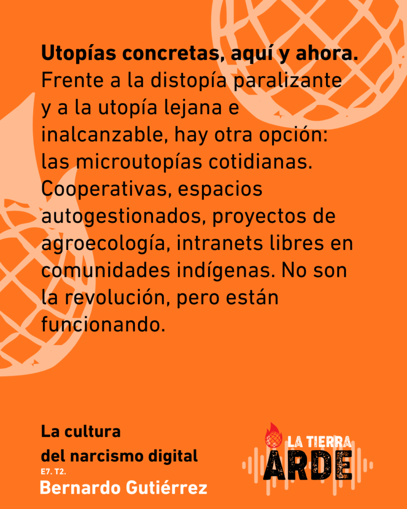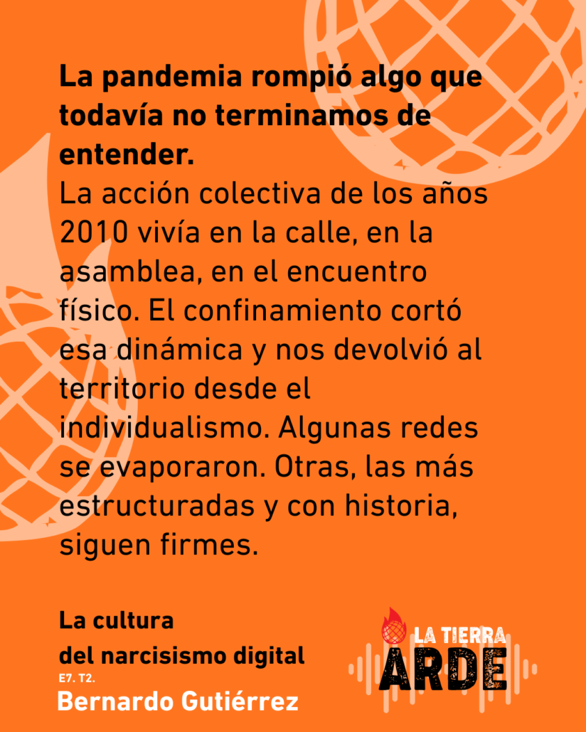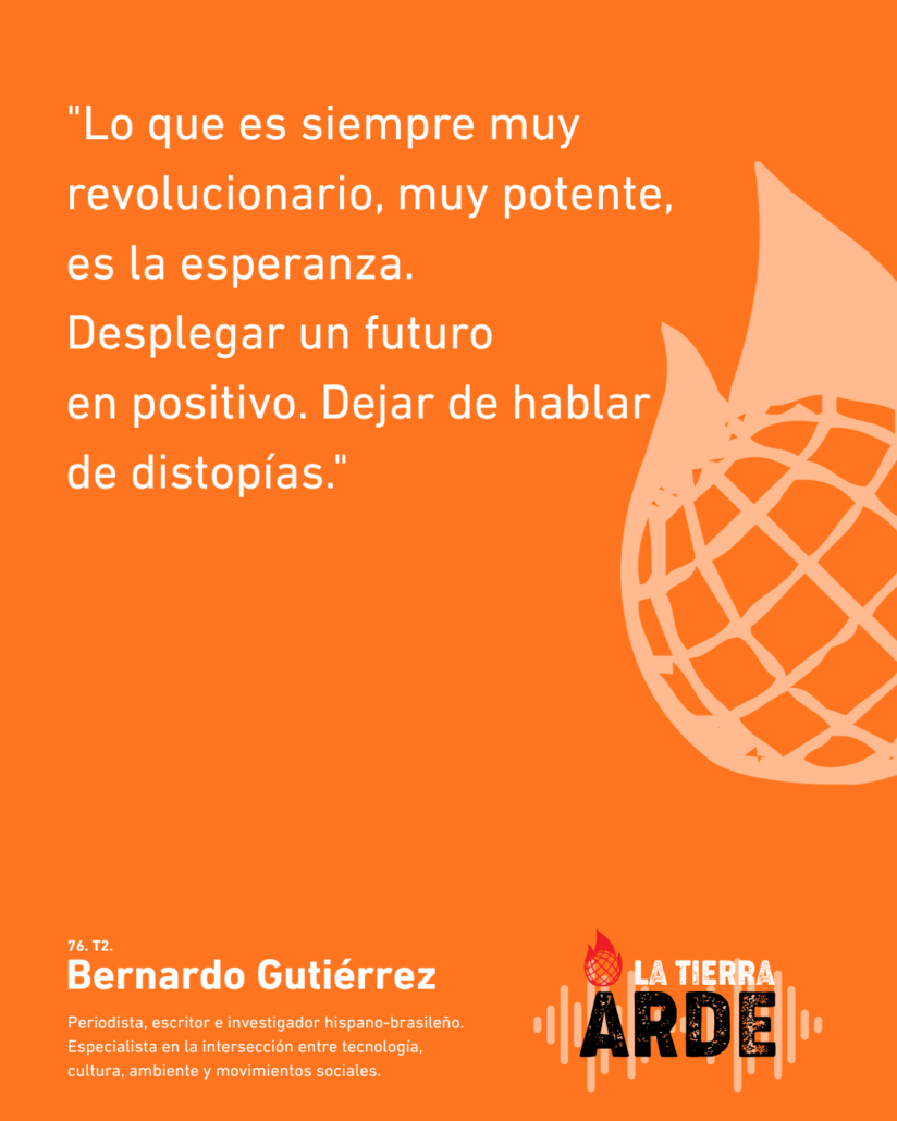 En el séptimo capítulo de La Tierra Arde conversamos con Bernardo Gutiérrez sobre el ascenso de la extrema derecha en las redes, el vaciamiento de las herramientas libres, la pandemia como quiebre de la acción colectiva y el concepto de futuro ancestral que propone el pensador indígena Ailton Krenak. Un recorrido que va del 15M al bolsonarismo, de Audrey Tang a las utopías cotidianas que siguen funcionando en silencio, y que termina con una apuesta: no hay nada más revolucionario que la esperanza.