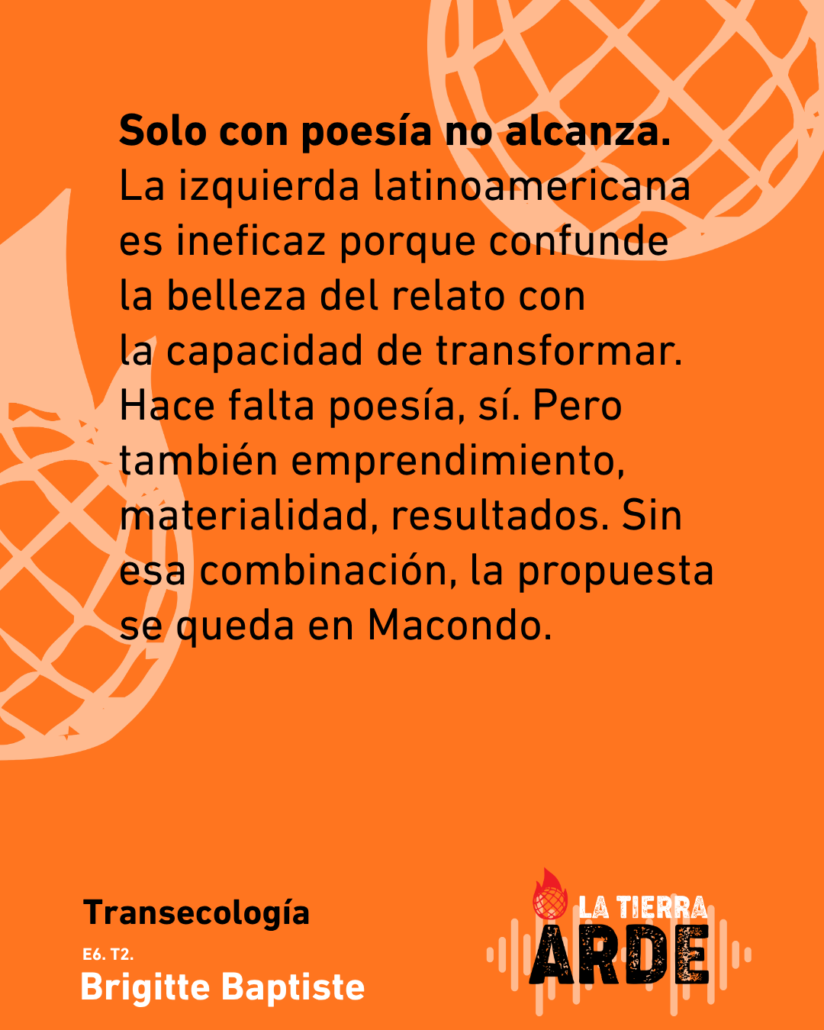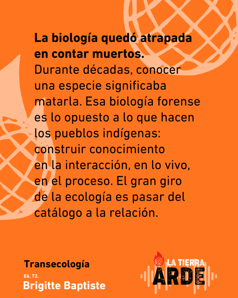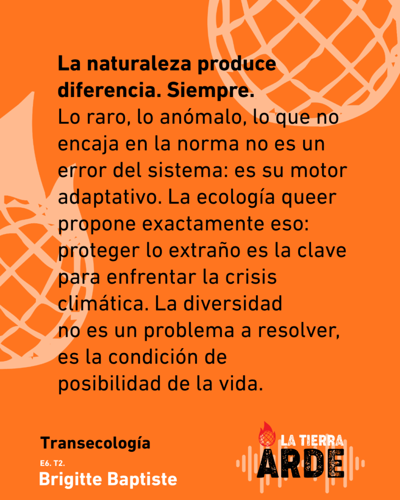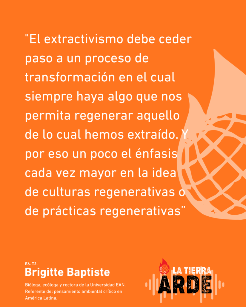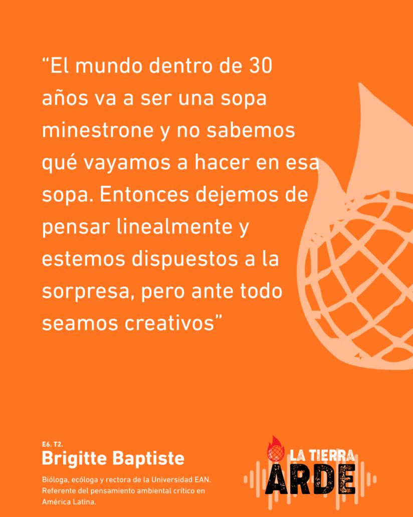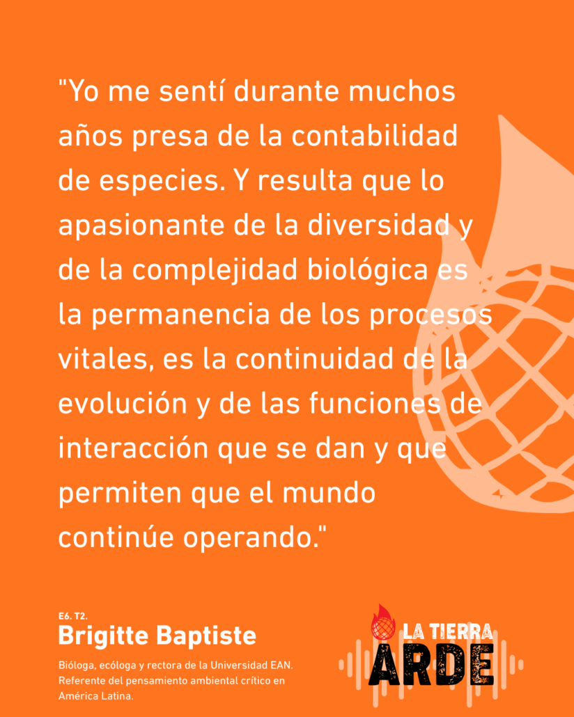 En el sexto capítulo de La Tierra Arde, con Brigitte Baptiste transitamos por una manera radicalmente distinta de habitar el mundo: del extractivismo a las culturas regenerativas, de la universidad como espacio de conversaciones retadoras a la biodiversidad como proceso vivo e irreductible. Una bióloga que piensa desde la complejidad, que no cree en las líneas rectas ni en los futuros predecibles, y que propone algo tan simple como urgente: estar dispuestas a la sorpresa y ser creativas ante lo que viene.